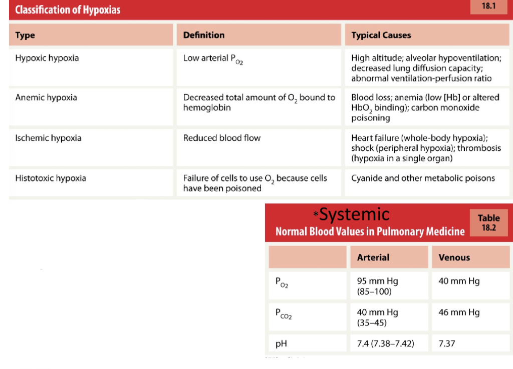 what are the types of hypoxia and the normal blood values in pulmonary medicine?