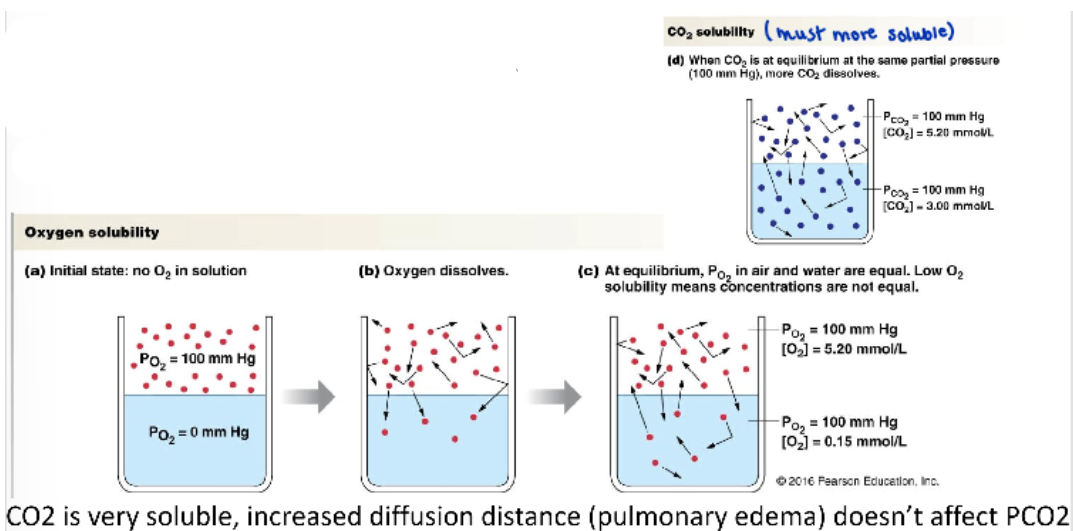 -the alveoli are lined with liquid, the small interstitial space between alveoli and capillaries contains liquid and the blood itself is liquid, therefore respiratory gases must be soluble in liquids