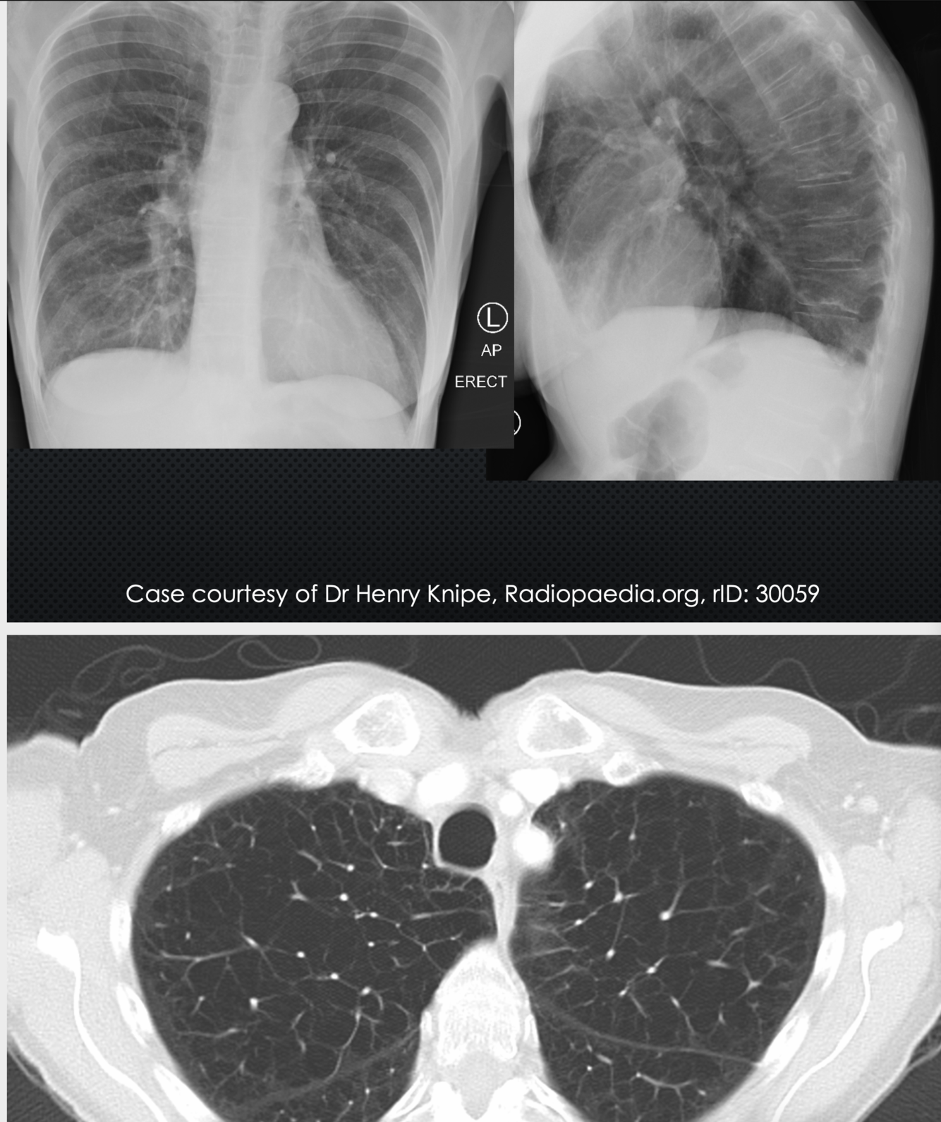 3. paraseptal emphysema; usually located adjacent to the pleural surfaces (including pleural fissues)– aka a more peripheral emphysema. associated with smoking and can lead to the formation of a sub pleural bullae and spontaneous pneumothorax