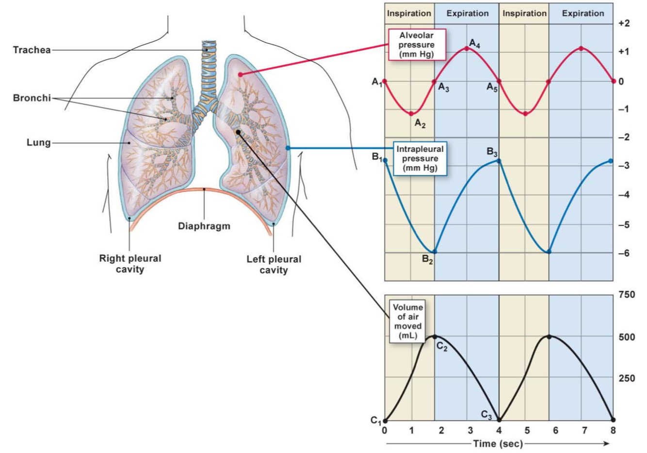 Diaphragm contracts –> thoracic cavity space increases –> intrapleural pressure decreases –> alveolar pressure decreases Drop in pressure creates a gradient where atmospheric pressure is greater than alveolar pressure, so air is suctioned into lungs
