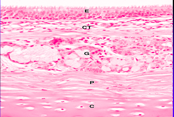 mucosa with epithelium and lamina propria; submucosa with sero-mucus glands andfibrous tissue of perichondrium
