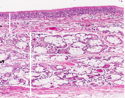 E= epithelium (pseudostratified ciliated columnar epithelium)