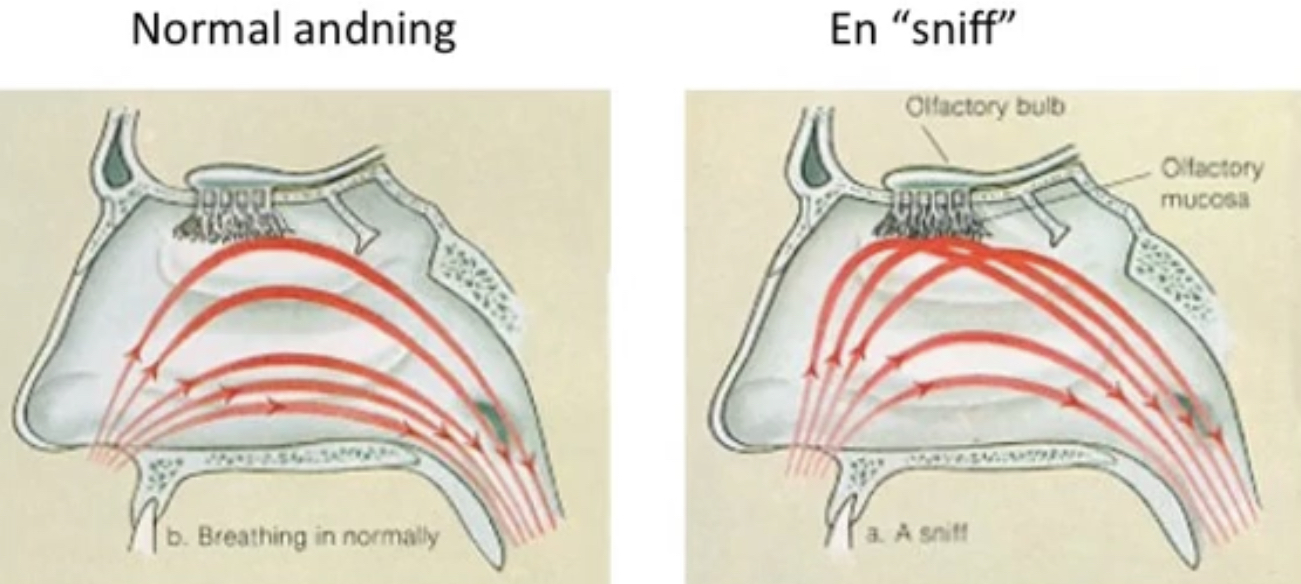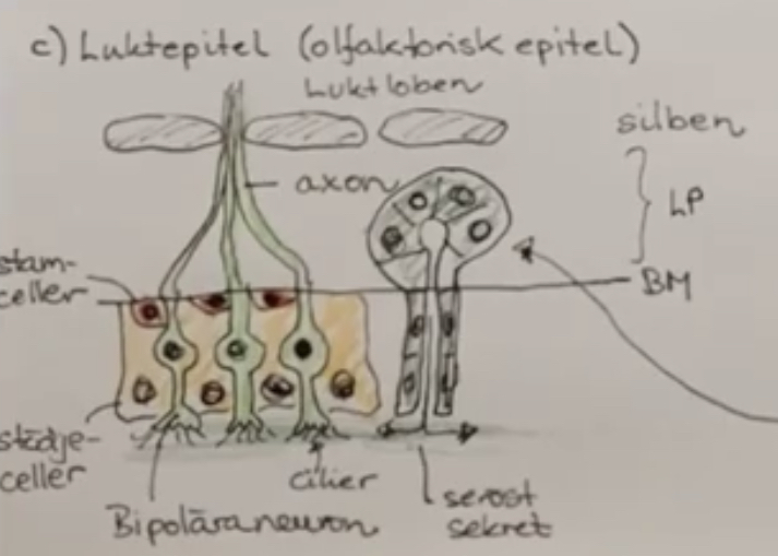 Bipolära neuron — skickar axon till luktloben, dendriter med cilier på apikalytan, luktreceptorer som är G-proteinkopplade och sitter på cilierna, kan binda in till olika luktmolekyler