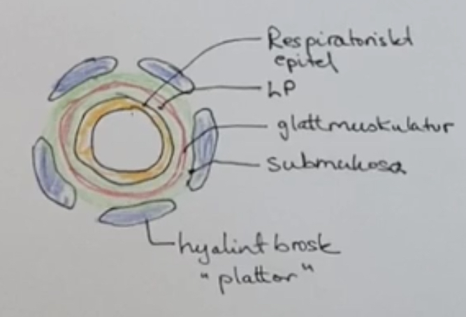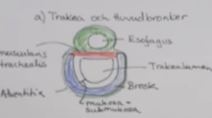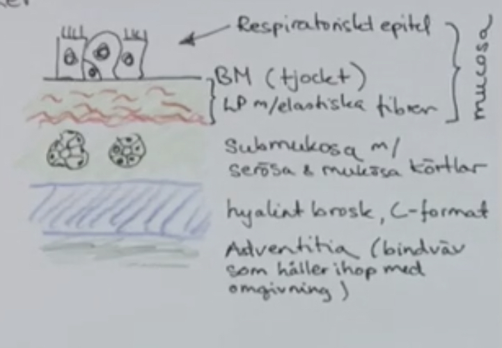 Mucosa = epitel + lamina propria — ingen musculus trachelaris i bronkerna → direkt till
