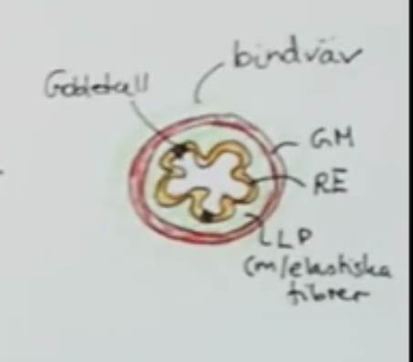 Epitelet är veckat med lamina propria innehållande elatiska fibrer