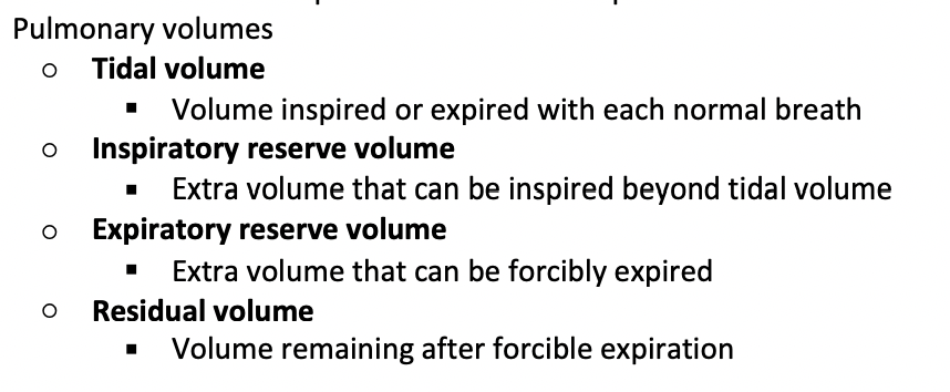 Define tidal volume, residual volume, inspiratory reserve and expiratory reserve volumes