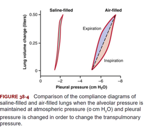 The lung with more surface tension. Example: saline filled lung (needs less pressure to change, so compliance is better), no surface tension. Only tissue elastic forces (recoil) present). So more transpleural pressure is neeed for air-filled lungs.