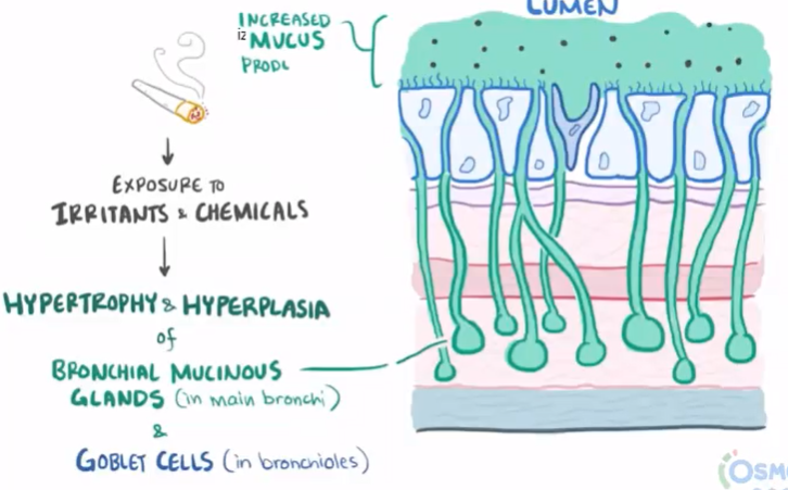 Hypertrophy and hyperplasia of bronchial mucinous glands and goblet cells. Also ciliary destruction. (ie due to cigarette smoke as main cause