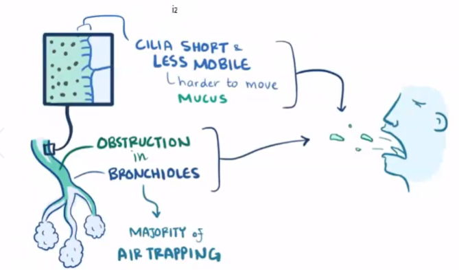 Bc bronchioles are small, a small amount of mucous can block them - leads to air trapping, where air can’t be exhaled - the majority of air trapping happens in the bronchioles
