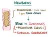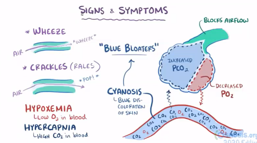 Mucus plugs block airflow, == high levels of CO2 and low levels of O2 in the lung