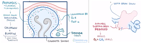 - Neutrophil proteases break down alveolar septa break down, REDUCES TOTAL SURFACE AREA -