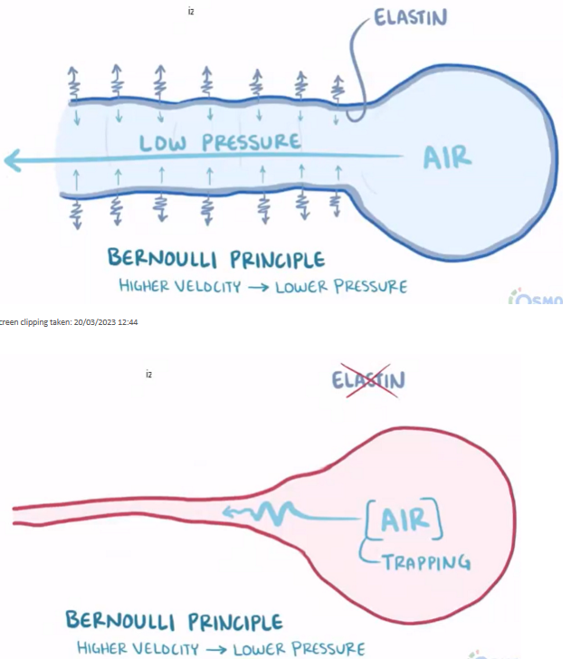 (due to Bernoulli principle that means that high velocity exhaled air creates low pressure in airways - elastin normally stops airways collapsing under low pressure)