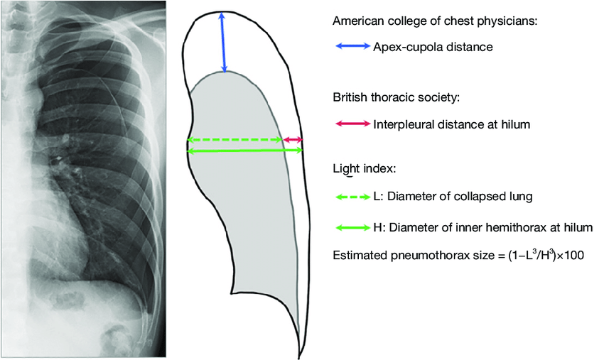 * size determined by distance from the lung apex to the ipsilateral thoracic cupola at the parietal surface as determined by an upright standard CXR