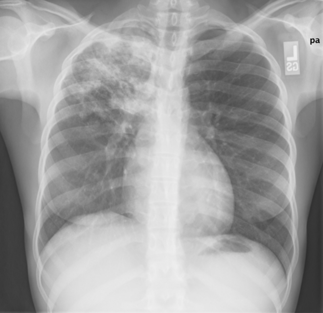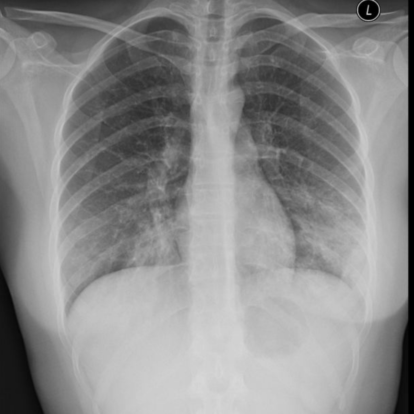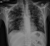 CXR: bilateral patchy interstitial infiltrates out of proportion to mild clinical findings.
