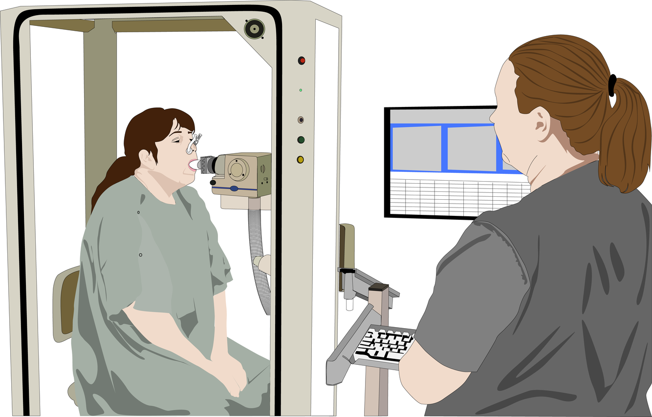 The test measures lung volume, capacity, rates of flow, and gas exchange.