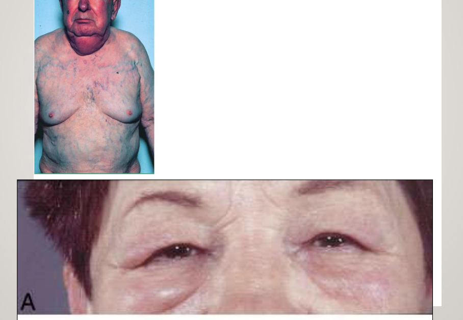 Cushing’s Syndrome -> small cell carcinoma secretes ACTH -> cortisol excess (weight gain, muscle weakness, striae)