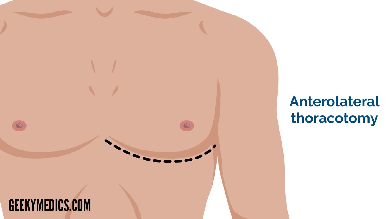 (also used for lobectomy, pneumoectomy, LVRS –> or a posterolateral thoracotomy scar)