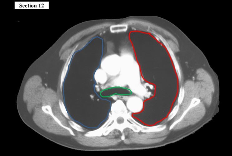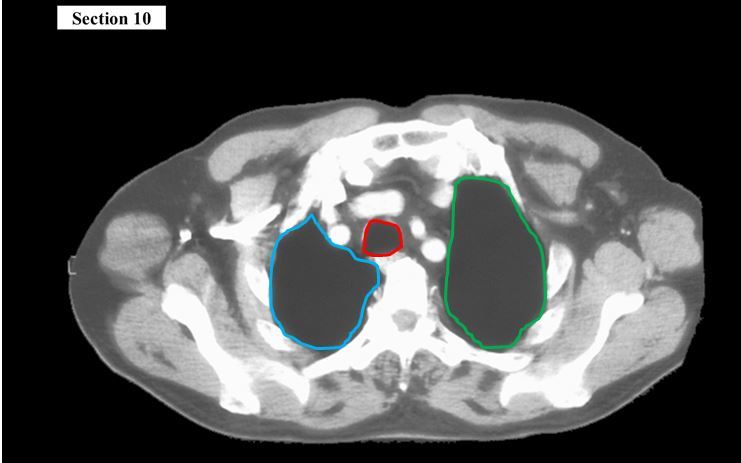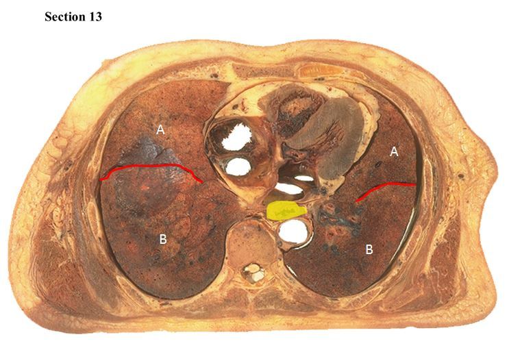Each red line is a/an _____ that separates a structure A which is a/an _____ from a structure B which is a/an _____within each lung.