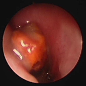 Destruction and white plaques – usually Aspergillus