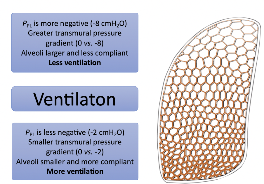 alveoli are smaller at the bottom of the lungs, so they are more open to change, so there is more ventilation