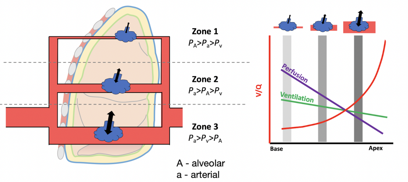 there is relatively more perfusion at the bottom of the lung that there is gas for exchange at the bottom of the lung and vice versa for the top of the lung