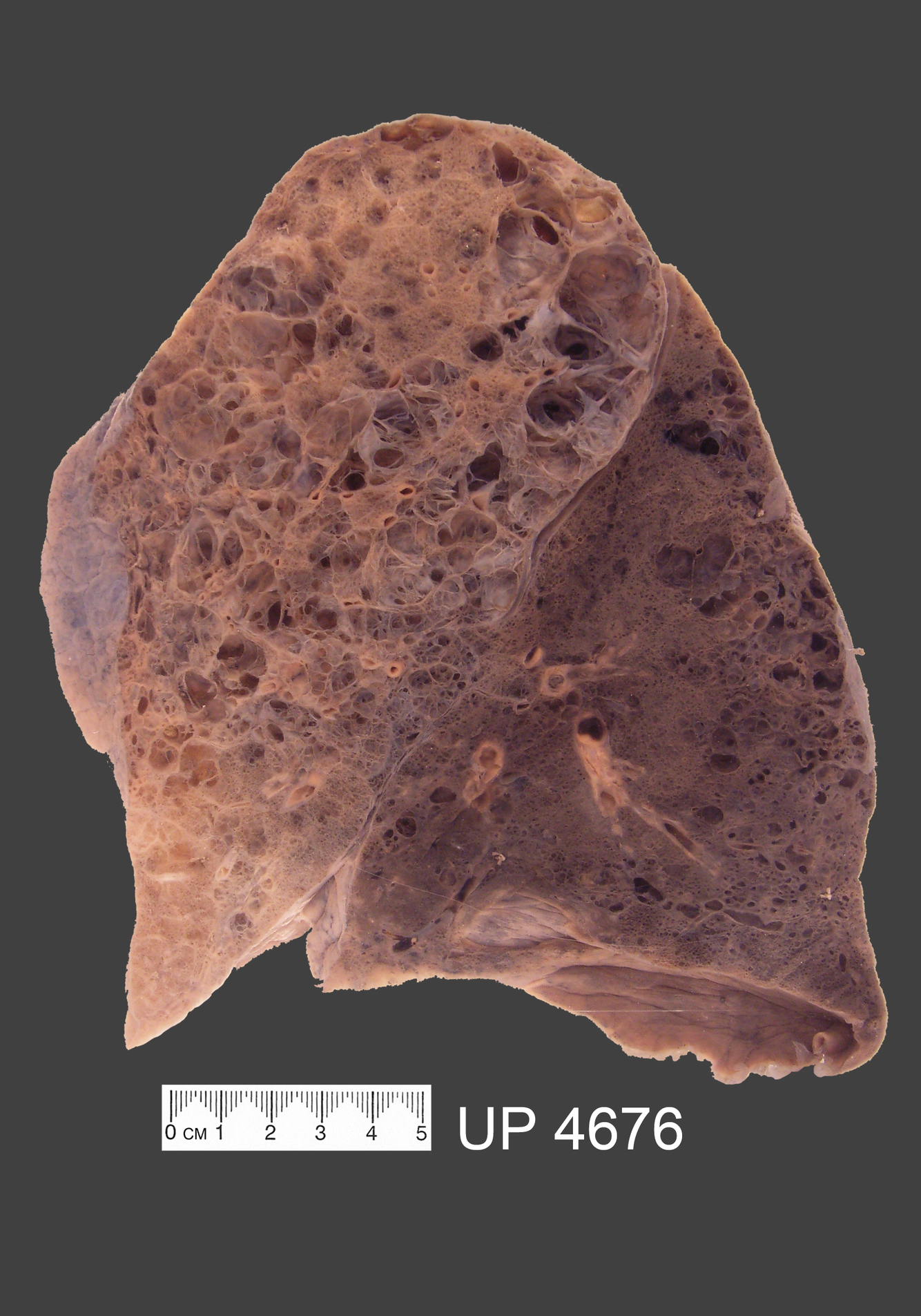 Lung parenchyma shows honeycomb appearance, with large cyst-like spaces, particularly in upper lobe.