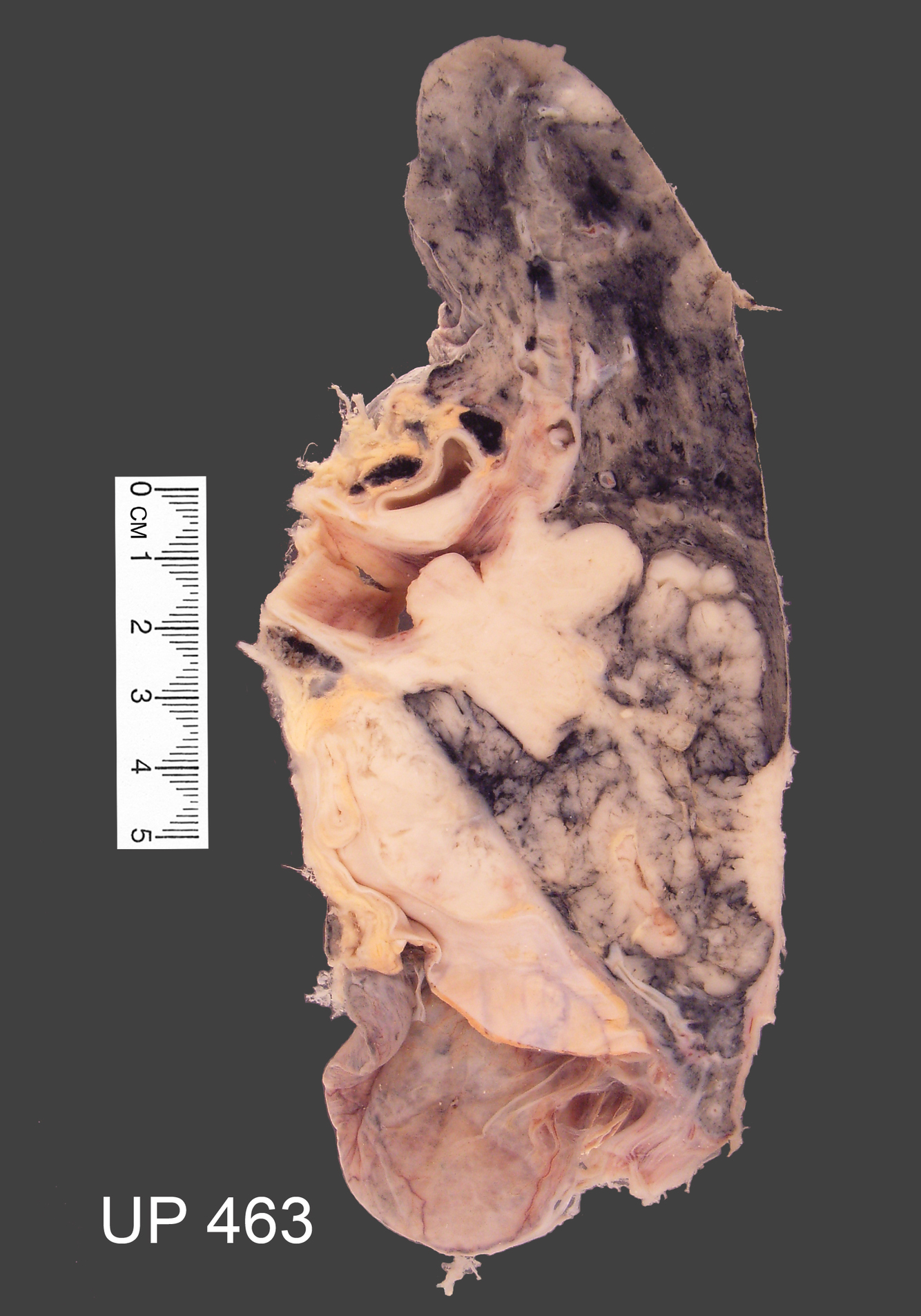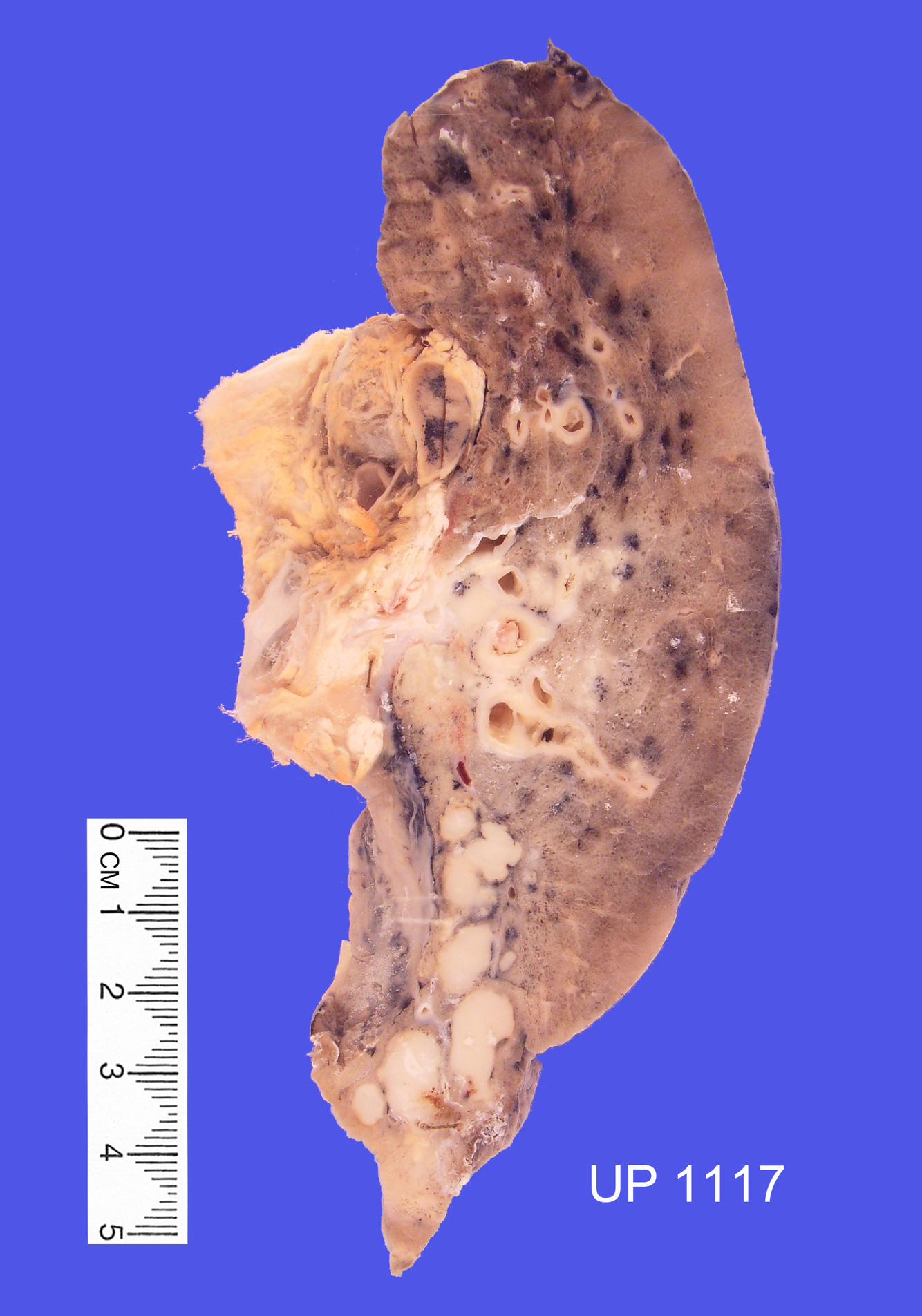 bronchi The cut surface shows prominent bronchi with thickened walls and mucous plugging.