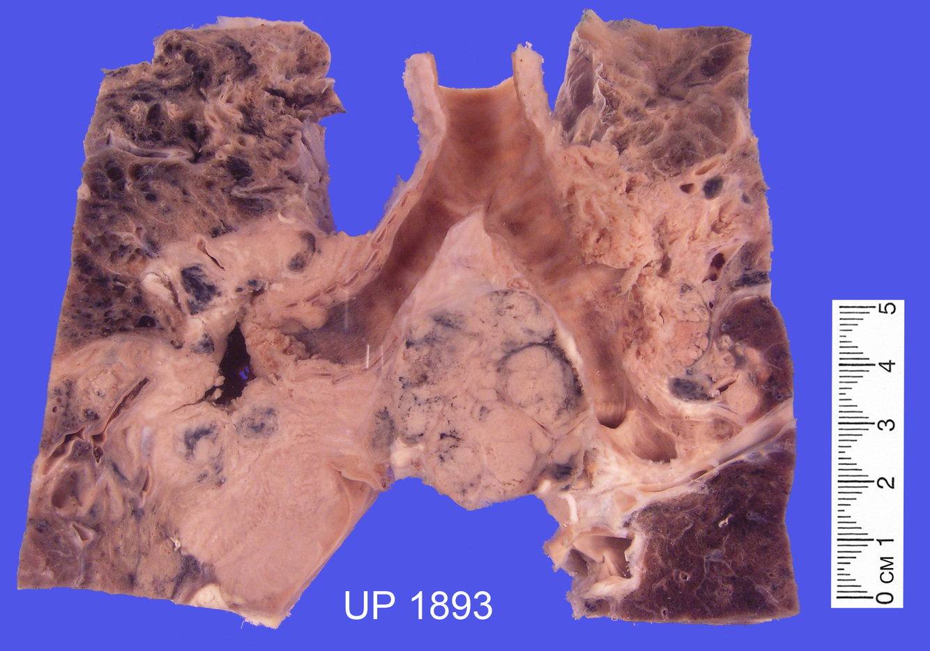 The specimen shows the bifurcation of the trachea, and portions of the left and right lungs.