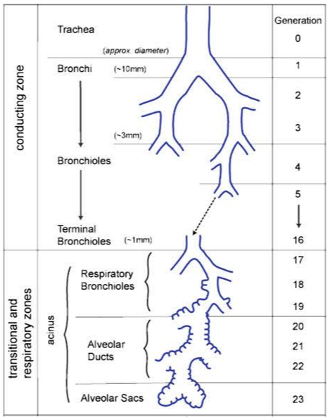 How many airway generations are there and at what generation does the respiratory zone begin?