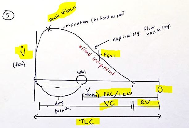 4) Total lung capacity is around the same, but there is a marked increase in RV (residual volume)