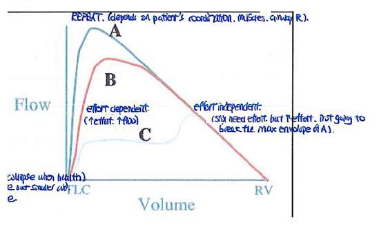 Eventually, expiratory flow cannot increase any further, and becomes independent of the effort. This is shown by plateau in P-V relationship