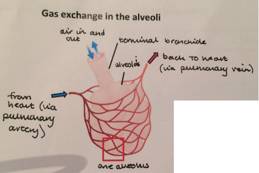 the air in the aveolus has a higher concentration of oxygen than the blood entering the capillary network - oxygen diffuses from the air to the blood