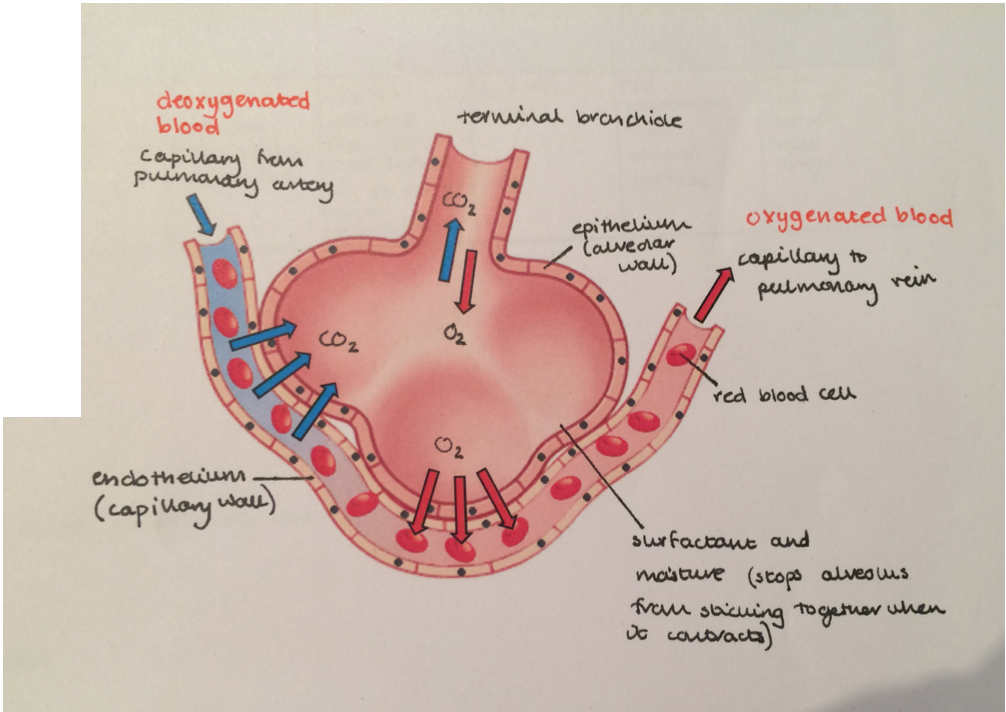 lots of capillaries - high surface area between capillaries and alveoli