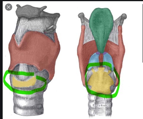 part of the larynx (just below the pharynx), and sits on a level plane just below the thyroid gland and thyroid cartilage. It is a circular piece of hyaline cartilage which wraps completely around the trachea, providing a place of attachment for various ligaments, muscles and other cartilage