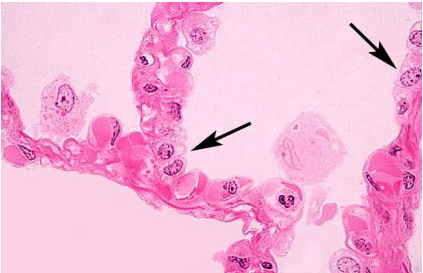 These are cuboidal-like cells with round nuclei and washed out, faomy cytoplasm. The cytoplasmic appearance is due to the lipid content