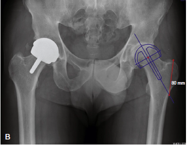 No Rx pré-op, mede-se a distância da ponta do GT até uma continuação da linha do componente femoral até a o córtex lateral do fêmur