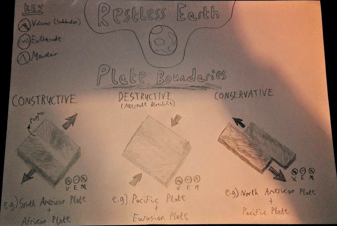 Name the 3 types of plate boundaries, the features found on them and an example.