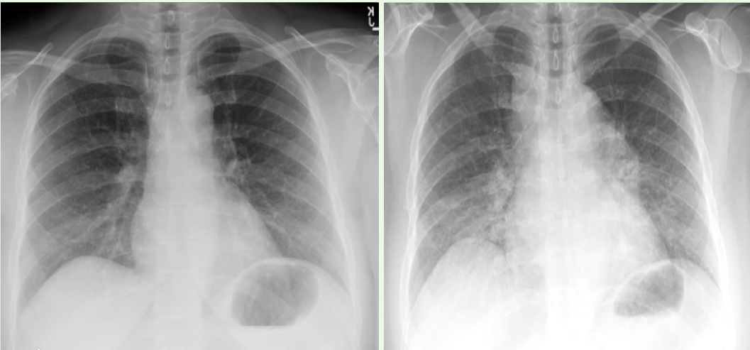 Left: • Normal, there is not any hilar inflammation etc. Right: • we see bilateral perihilar infiltrates with increased opacity in the lateral aspect of both lungs