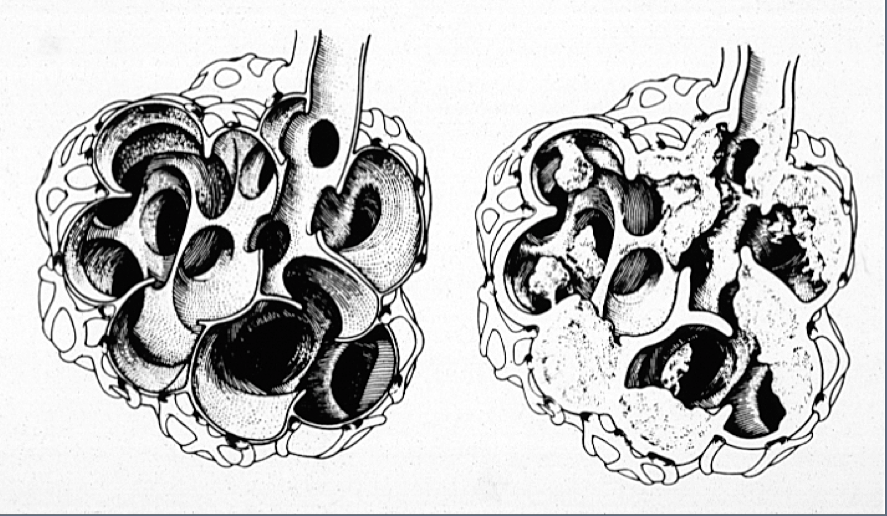Fibrotic tissue fills up the space between the vessels and alveolar sacs and causes a reduction in TLC, this also reduces the SA available for oxygen exchange