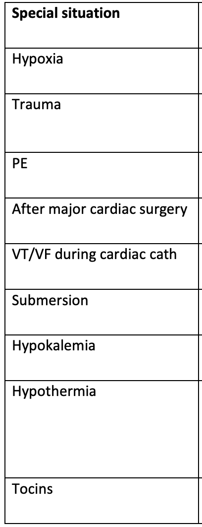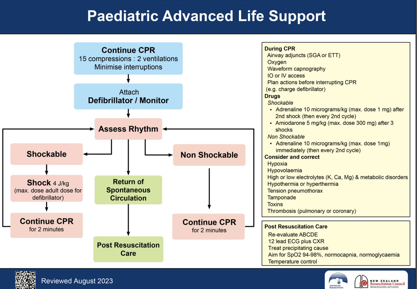 Shockable - adrenaline 10mcg/kg every second shock and amioderone 5mg/kg after third