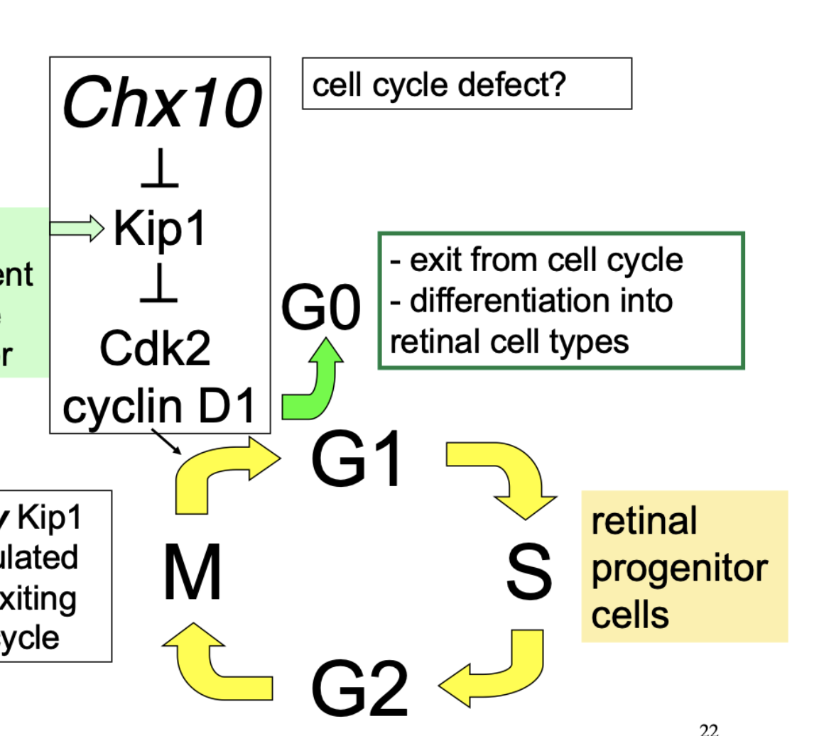 Chx10 normally inhibits Kip1 which is a cdk inhibitor. With kip1 active, cdk and cyclin D1 will be inactive and the cell will not progress to S phase, cells will exit the cell cycle (G0) and will differentiate prematurely into retinal cells