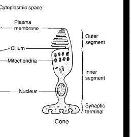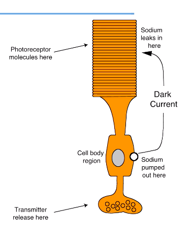 constant inward leak of sodium in outerpart of the receptor: keeps the cell depolarised. causes the release of glutamate from its synaptic ending