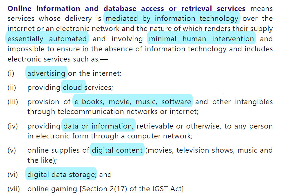 What is the definition or meaning of Online information and database access or retrieval services as per section 2(17) of the IGST act?