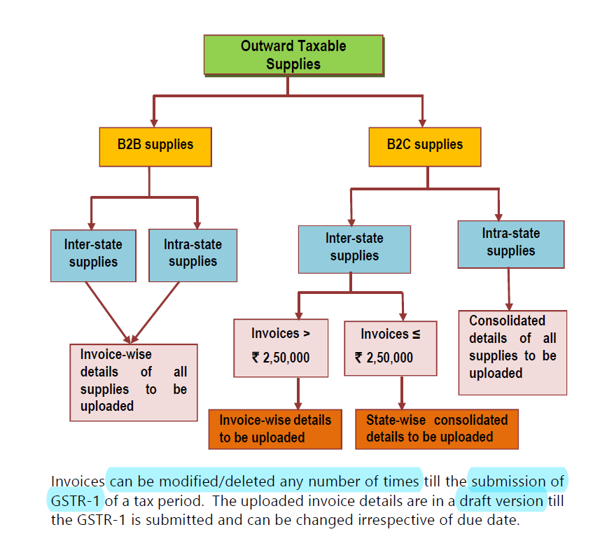 The registered person is required to furnish details of invoices and revised invoices issued in relation to supplies made by him to registered and unregistered persons during a month(also information about debit and credit notes has to be given)