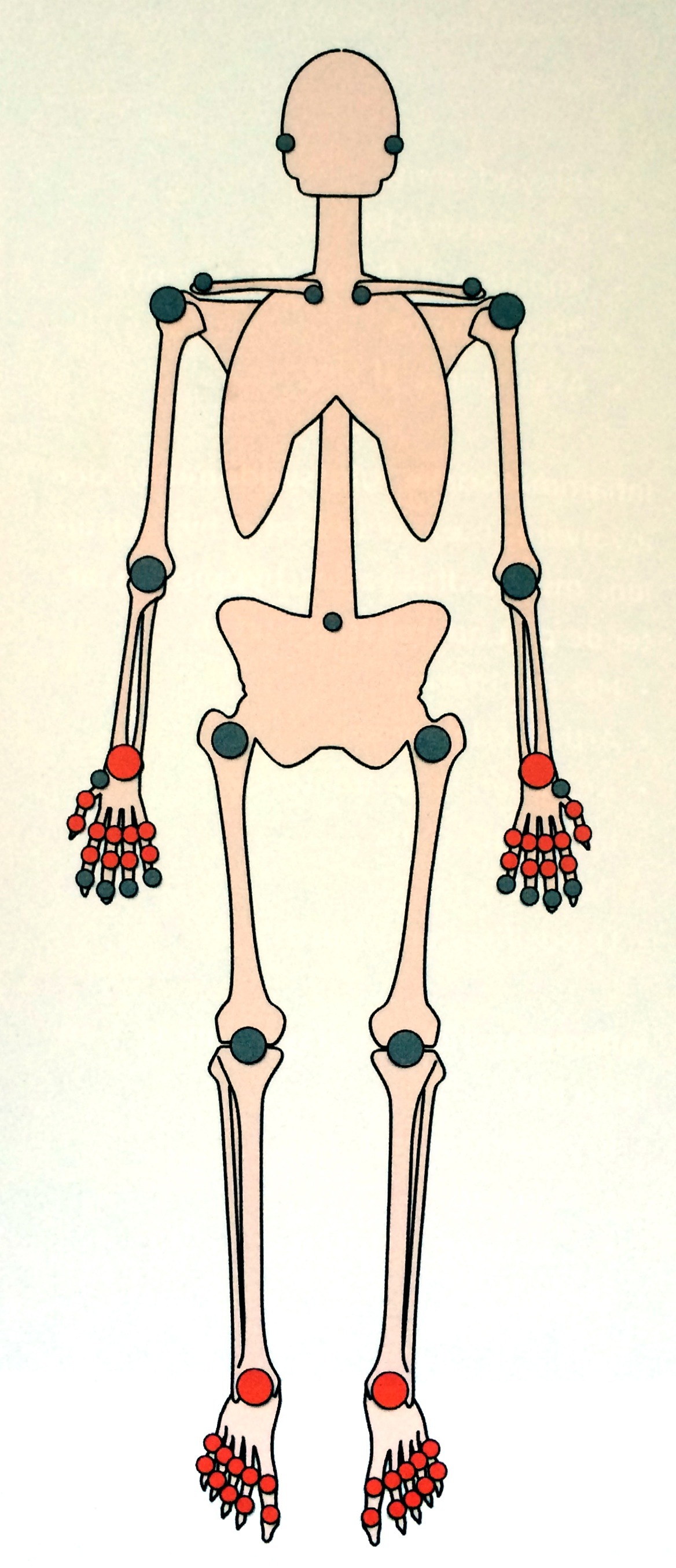 S: uger-måneder - smerter, stivhed, hævelse af (se figur) Symmetrisk progression. noduli rehumatici, neuropati, mononeuritis multiplex, vasculitis, episclerit, sclerit, pleurit, pneumonitis, pericaditis, glandelsvulst, Leddeformitet.