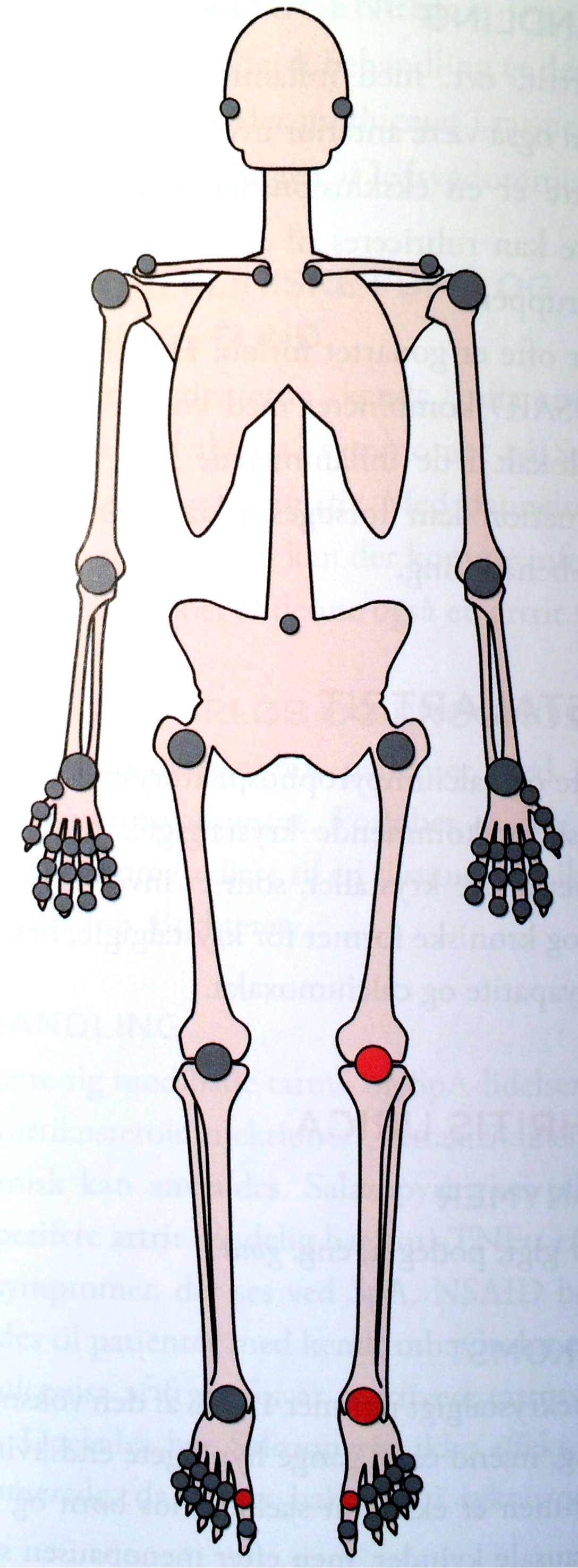 B: NSAID, steroid (intra), hvis mange led steroid po (0,5 mg/kg dgl 2-8 uger). Rehab.