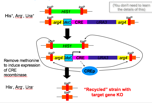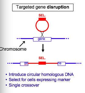 Circular homologous DNA with SEL is introduced. Select for cells expressing marker. Single crossover occurs within the gene on the chromosome. Therefore it is disrupted and not expressed
