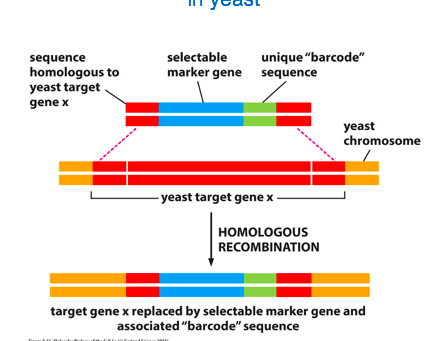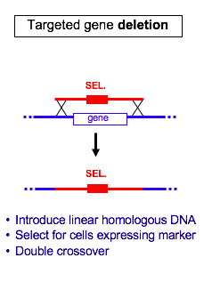 linear homologous dna with SEL is introduced. Select for cells expressing marker. Gene is deleted due to a double crossover on each side of the the gene