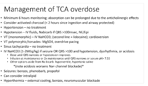1. Sodium channel blockade - Wide QRS, seizures, prominent R wave in AVR