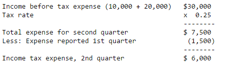 Bard Co., a calendar-year corporation, reported income before income tax expense of $10,000 and income tax expense of $1,500 in its interim income statement for the first quarter of the year. Bard had income before income tax expense of $20,000 for the second quarter and an estimated effective annual rate of 25%. What amount should Bard report as income tax expense in its interim income statement for the second quarter?